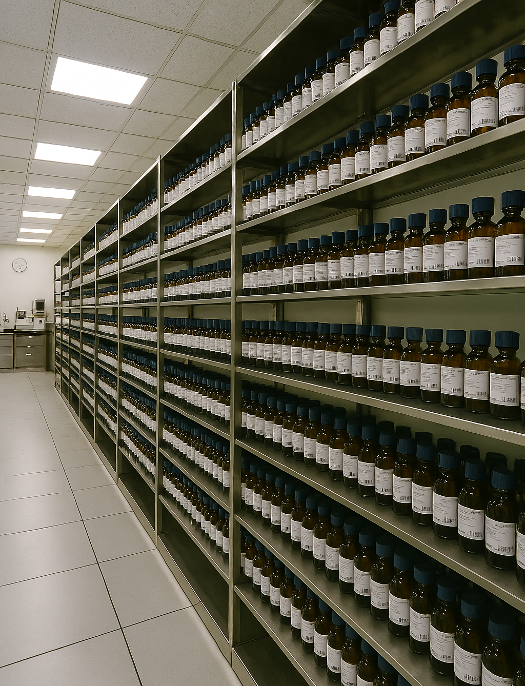 The image you see is the heart of our operation: a meticulously organized lab where over 10,000+ distinct chemical compounds are housed, representing the essential building blocks for the thousands of taste profiles we craft for our clients every year.